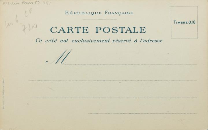Werbepostkarte einer Serie; Grafik, monochrom; Rückseite: Mann/Sekretär mit Schreibmaschine Densmore; Text Nr. 5: Je travaille avec ardeur [...] Vorderseite nicht beschrieben
