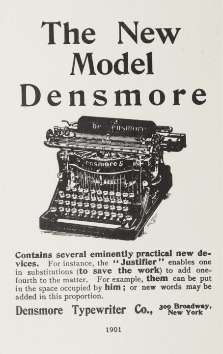 Werbepostkarte, Nachdruck; Grafik, monochrom Rückseite: Schreibmaschine Densmore mit Werbetext, darunter die Jahreszahl 1901 Vorderseite nicht beschrieben