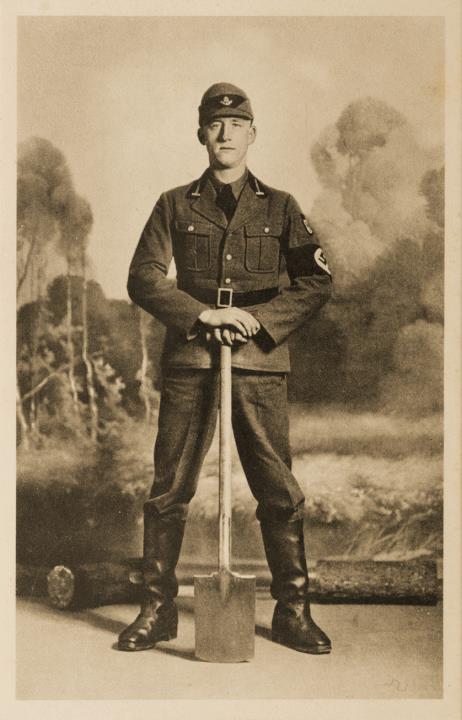 Werbepostkarte; Grafik, Fotografie, monochrom; Nr. C 7586 34 Rückseite: Porträtfoto Soldat in Uniform Vorderseite: Werbetext; nicht beschrieben