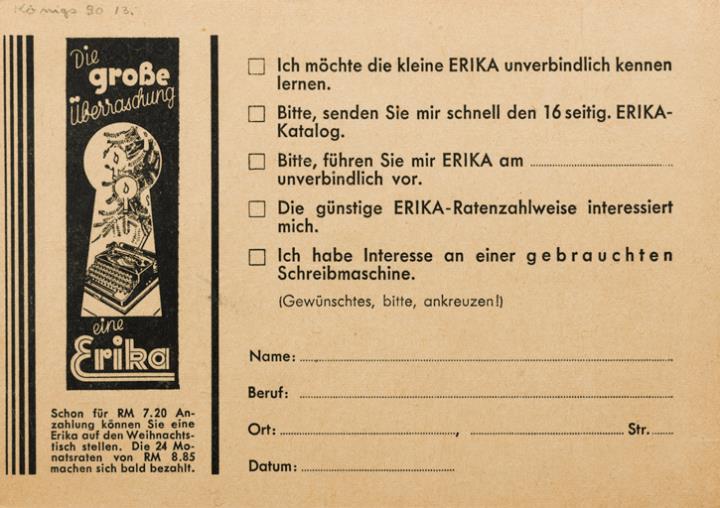 Antwortkarte; Grafik, monochrom; Nr. S7295 Vorderseite: Schreibmaschine Erika, vorgedruckte Anschrift Firma Büro-Organisation Saueracker, Nürnberg; Rückseite: Werbetext, vorgedruckter Bestelltext