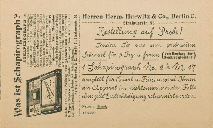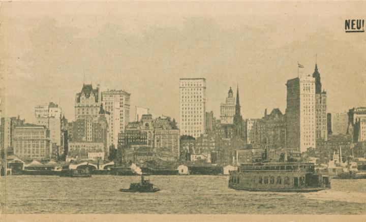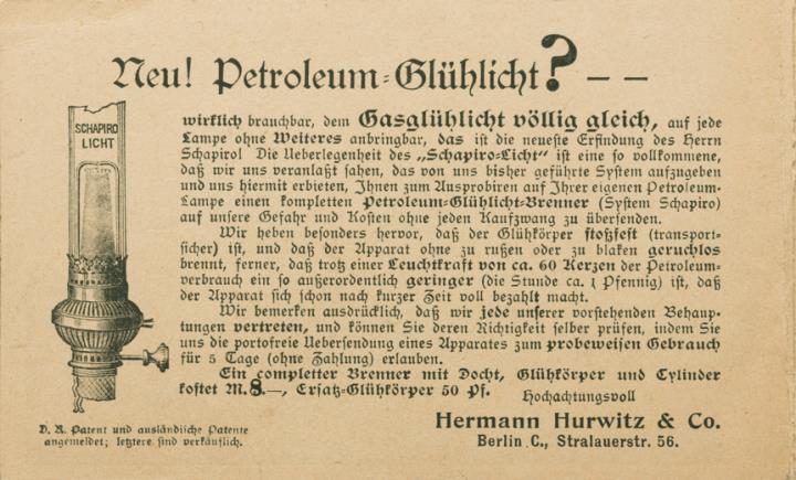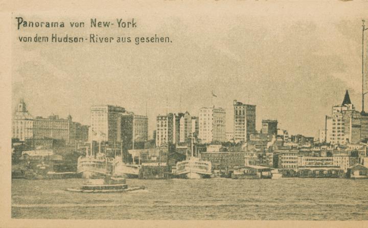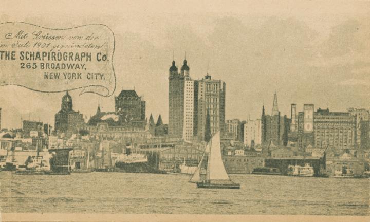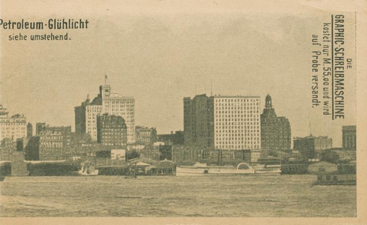 Werbepostkarte (Leporello) der Fachhandlung Hermann Hurwitz & Co. Berlin Außenteil: Anschriftseite / drei Seiten Werbung zu Petroleum-Glühlicht Schapiro-Licht, Vervielfältigungsapparat Schapirograph, Schreibmaschine Graphic und Gasglühlicht Jos. Auer & Co. Innenteil: "Panorama von New York von dem Hudson-River aus gesehen"; Text: Mit Grüssen von der im Juli 1901 gegründeten The Schapirograph Co. New York City