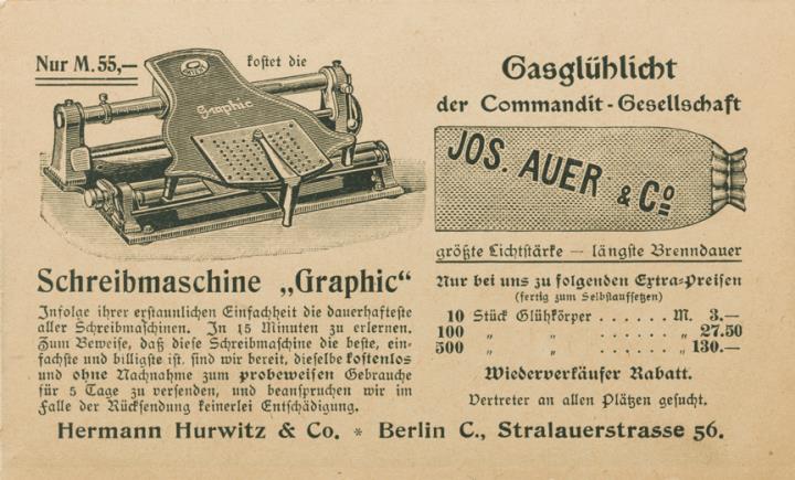 Next to literature on the history of technology, of the typewriter and the office, the Archive holds patent letters, textbooks and instruction manuals as well as historical postcards, letters, photographs and various kinds of advertising (leaflets and brochures, advertising stamps, newspaper ads, posters and signs, promotional gifts).