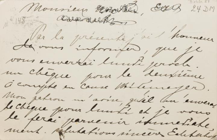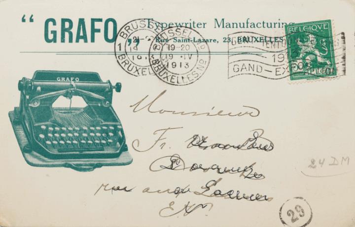 Postkarte mit Werbebild; Grafik, monochrom Vorderseite: Schreibmaschine Grapho; adressiert; Briefmarke Postes Belgique 5c; Poststempel Brüssel 19 IV 1913 Rückseite beschrieben