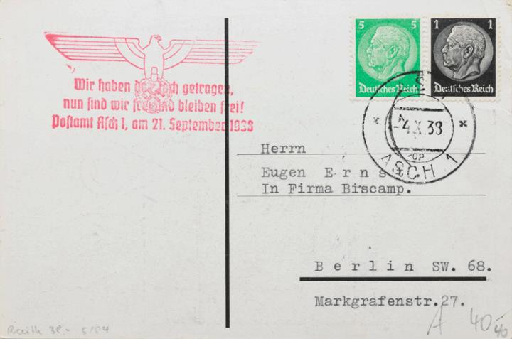 Werbepostkarte; Grafik, polychrom Rückseite: Fabriksgebäude von G.F. Grosser, Markersdorf (Chemnitztal), Hersteller der Groma Schreibmaschinen; Vorderseite: adressiert an Herrn Ernst / Fa. Biscamp, Berlin; Briefmarken Deutsches Reich 5 + 1 RPf., Poststempel Asch/4.X.1938; Sonderstempel 21. September 1938 (Besetzung des Sudetenlandes)