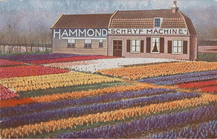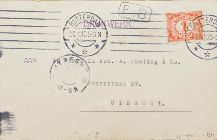 Werbepostkarte; Grafik, polychrom Rückseite: Ansicht Gebäude neben Tulpenfeld Vorderseite: adressiert an Fa. Ebeling & Co, Utrecht; Briefmarke Nederland 1 Cent; Poststempel Rotterdam/20.4.1910