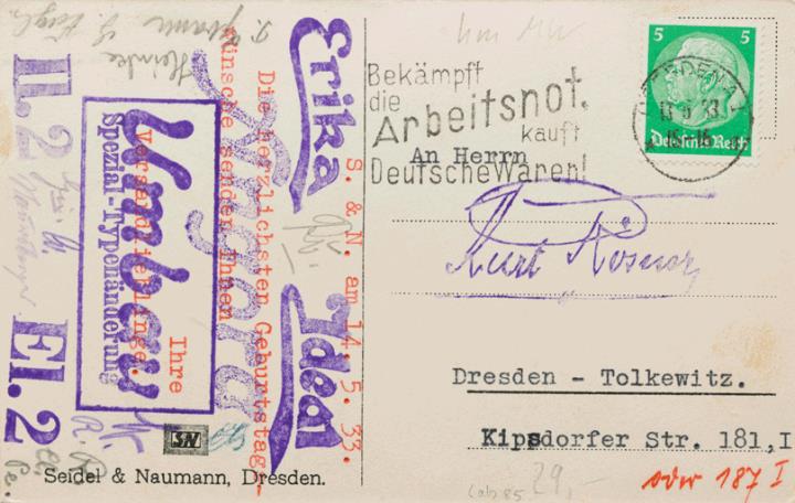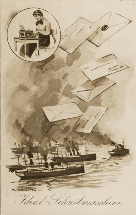 Werbepostkarte; Grafik, monochrom Rückseite: Frau mit Schreibmaschine Ideal, Briefe, Schiffsflotte auf See Vorderseite: mit Schreibmaschine beschrieben; adressiert an Kurt Rösner, Dresden; Briefmarke Deutsches Reich 5 RPf.; Poststempel 13.5.1933