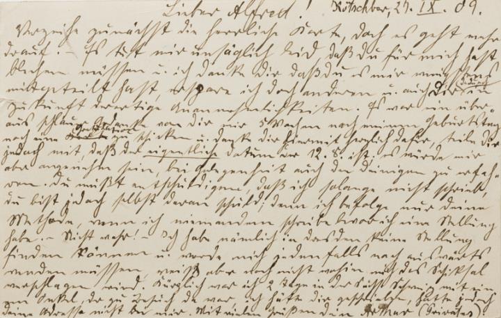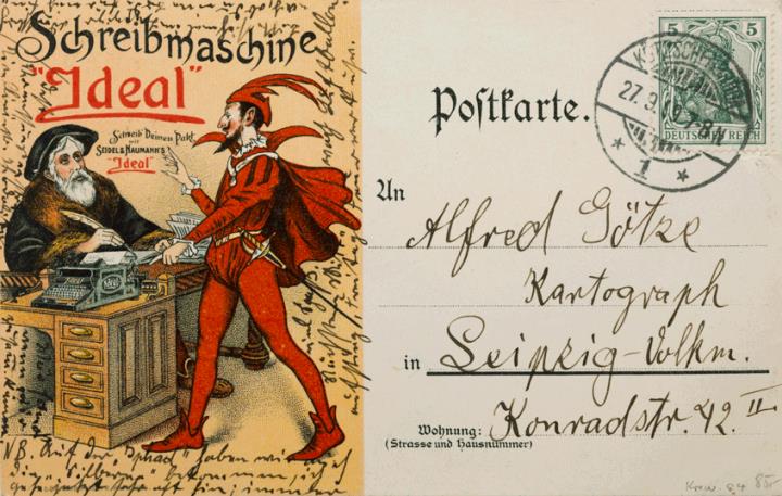 Postkarte mit Werbebild; Grafik, polychrom Vorderseite: Faust-Szene mit Schreibmaschine Ideal, Text: Schreib' Deinen Pakt mit Seidel & Naumann's Ideal; beschrieben; adressiert an Alfred Götze, Leipzig; Briefmarke Deutsches Reich 5 Pf.; Poststempel 27.9.1909 Rückseite beschrieben