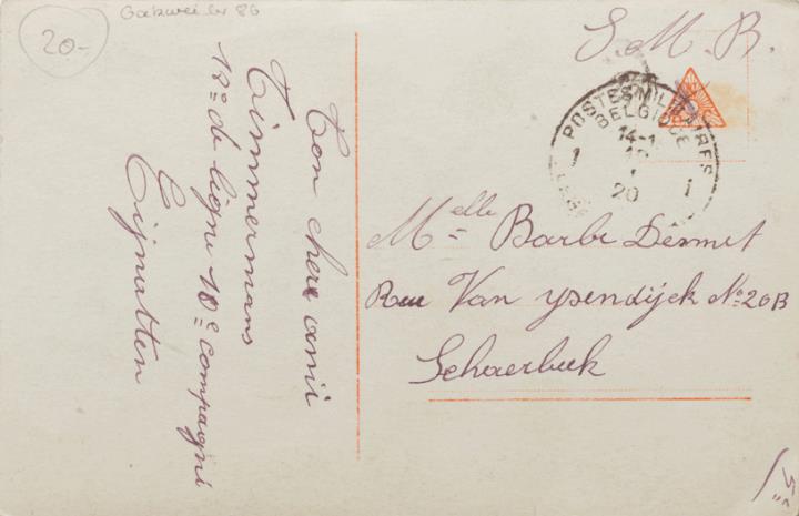 Werbepostkarte; Fotografie, monochrom; Nr. 4045/6 Rückseite: Frau mit Schreibmaschine Ideal Vorderseite: adressiert an M.lle Desmet, Sehaerbuk; Poststempel Postes Militaires Belgique