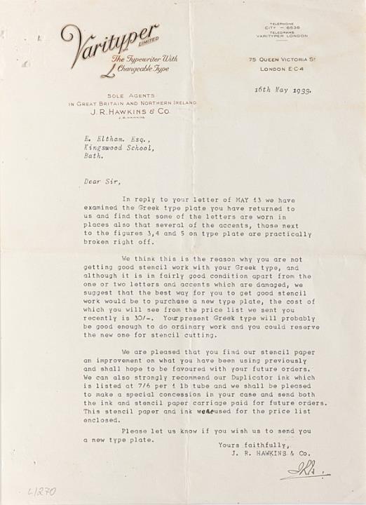 Brief der Schreibmaschinenhandlung J.R. Hawkins & Co., London adressiert an E. Eltham. Esq., Bath; datiert 16.05.1933 Maschinenschrift, unterschrieben