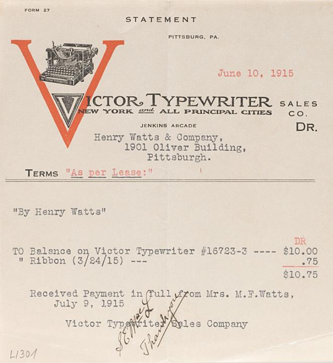 Quittung der Victor Typewriter Sales Company, Pittsburgh adressiert an Henry Watts and Company, Pittsburgh; datiert 10.06.1915 Maschinenschrift, unterschrieben