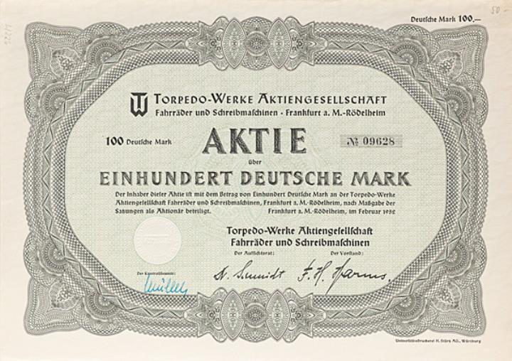 Aktie Nr. 9628 der Torpedo Werke A.G. über 100 DM datiert Frankfurt, Februar 1952 Druck: Universitätsdruckerei Stürtz