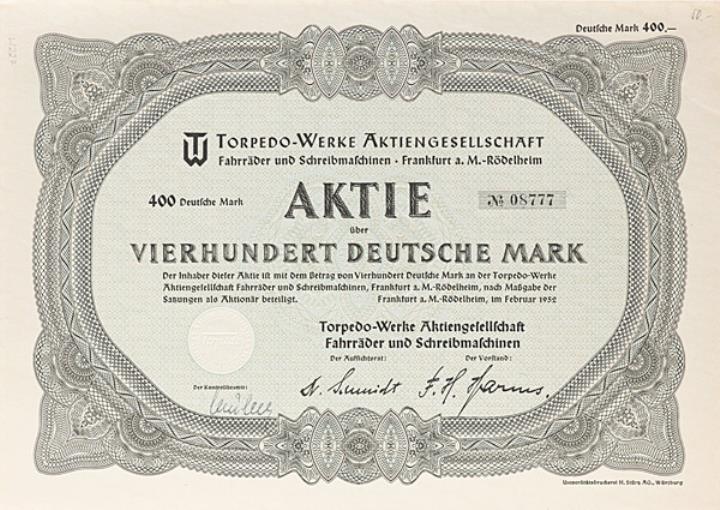 Aktie Nr. 8777 der Torpedo Werke A.G. über 400 DM datiert Frankfurt, Februar 1952 Druck: Universitätsdruckerei Stürtz