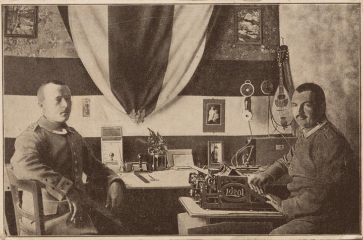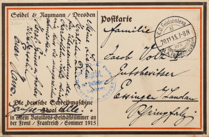 Werbepostkarte; Fotografie, monochrom Rückseite: zwei Männer in Uniform mit Schreibmaschine Vorderseite: Beschreibungstext: Die deutsche Schreibmaschine Ideal in einem Bataillons-Geschäftszimmer an der Front/Frankreich/Sommer 1915; beschrieben, adressiert an Familie Volz, Essingen Landau; Feldpoststempel Falkenhausen/20.11.15