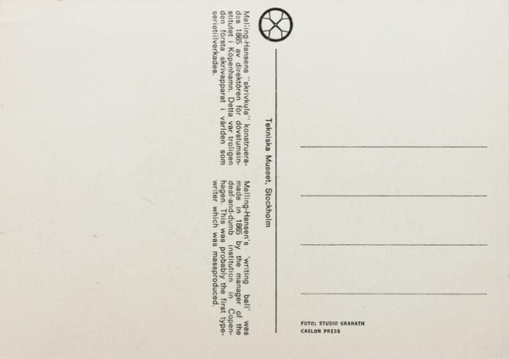 Illustrierte Postkarte; Fotografie, polychrom Rückseite:Schreibmaschine (Schreibkugel) Malling-Hansen aus dem Technischen Museum Stockholm Vorderseite: Beschreibungstext; nicht beschrieben