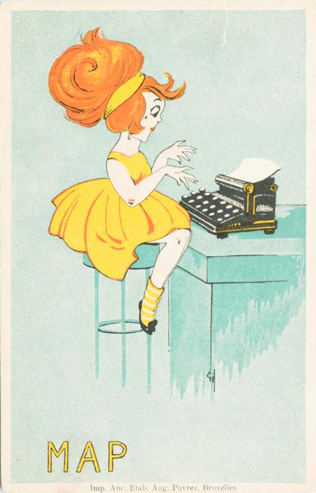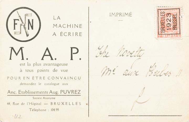 Werbepostkarte; Grafik, polychrom Rückseite: Frau mit Schreibmaschine MAP Vorderseite: Werbetext; adressiert an M.e aux Herbes; Briefmarke Postes Belgique 3c; Poststempel Brüssel 1923