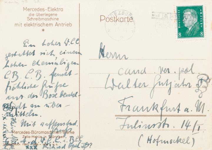 Werbepostkarte; Grafik, polychrom; Nr. 1120/7 Rückseite: Frau/Sekretärin mit elektrischer Schreibmaschine Mercedes, Werbetext in Versform Vorderseite: beschrieben; adressiert an Herrn Gutjahr, Frankfurt a M.; Briefmarke Deutsches Reich 8 RPf.; Poststempel Würzburg/3.8.1929