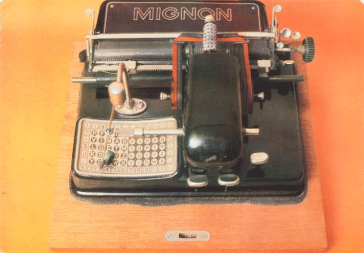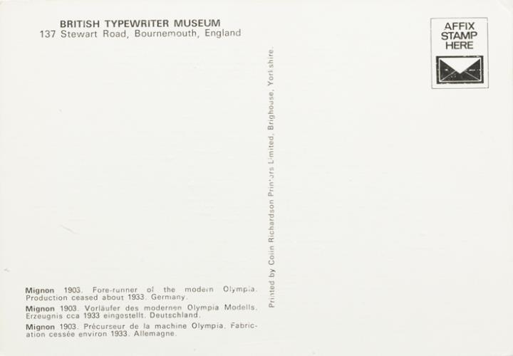 Next to literature on the history of technology, of the typewriter and the office, the Archive holds patent letters, textbooks and instruction manuals as well as historical postcards, letters, photographs and various kinds of advertising (leaflets and brochures, advertising stamps, newspaper ads, posters and signs, promotional gifts).