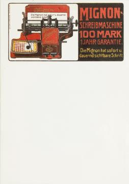 Werbepostkarte, Nachdruck; Grafik, polychrom Rückseite: Schreibmaschine Mignon und Werbetext; Leerraum zur Beschriftung Vorderseite nicht beschrieben