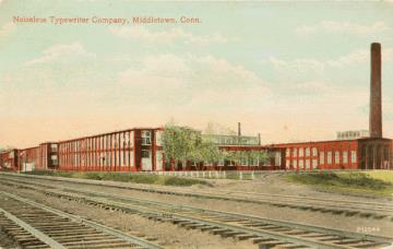 Illustrierte Postkarte; Fotografie, koloriert; Nr. P12544 Rückseite: Gebäudeansicht der Noiseless Schreibmaschinenwerke Vorderseite: beschrieben; adressiert an Miss Kalley, Rhode Island; Briefmarke U.S. Postage 1 Cent; Poststempel Cobalt/Aug 14 1912