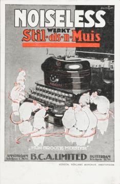 Werbepostkarte; Grafik, polychrom; Grafik: Berndsen Rückseite: Schreibmaschine Noiseless umgeben von Mäusen; darunter Text: B.C.A. Limited, Rotterdam; Vorderseite nicht beschrieben