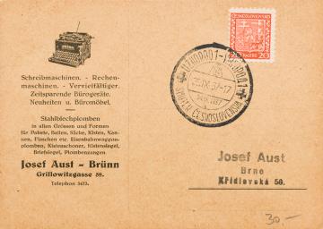Postkarte mit Werbebild; Grafik, monochrom Vorderseite: Schreibmaschine Odoma, Werbetext; Adressstempel Josef Aust, Brno; Briefmarke Ceskoslovensko 20 Haleru; Poststempel Uzhorod/25.IX.1937-17 Rückseite: nicht beschrieben