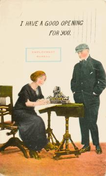 Werbepostkarte; Fotografie, polychrom; Theochrom Serie Nr. 1331 Rückseite: Büroszene; Vorgesetzter und Sekretärin mit Schreibmaschine Oliver Vorderseite: adressiert an Mrs. Clough; Briefmarke U.S. Postage One Cent; Poststempel Bangor, Maine/Oct 11 1912