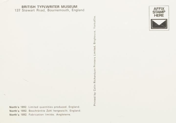 Illustrierte Postkarte; Fotografie, polychrom Rückseite: Schreibmaschine North's Vorderseite: Beschreibungstext, nicht beschrieben