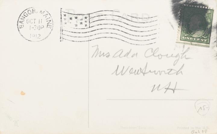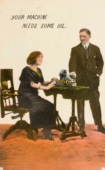 Werbepostkarte; Fotografie, polychrom; Theochrom Serie Nr. 1331 Rückseite: Büroszene; Vorgesetzter und Sekretärin mit Schreibmaschine Oliver Vorderseite: adressiert an Mrs. Clough; Briefmarke U.S. Postage One Cent; Poststempel Bangor, Maine/Oct 11 1912