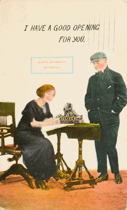 Werbepostkarte; Fotografie, polychrom; Theochrom Serie Nr. 1331 Rückseite: Büroszene; Mitarbeiter und Sekretärin mit Schreibmaschine Oliver Vorderseite: adressiert an Miss Cunningham; Briefmarke U.S. Postage 1 Cent; Poststempel Hammond/ May 27 7 1913