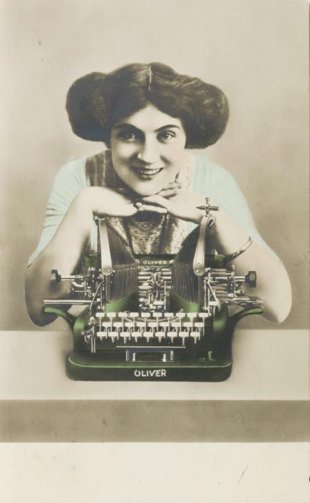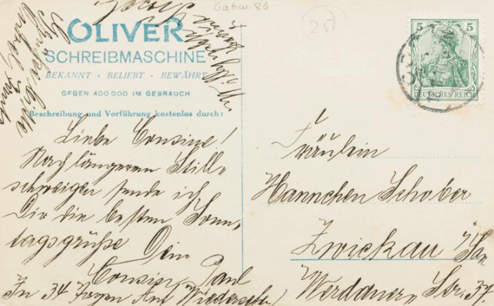Werbepostkarte; Fotografie, koloriert; Rückseite: Frau mit Schreibmaschine Oliver, Blick zum Betrachter; Vorderseite: adressiert an Fräulein Schober, Zwickau; Briefmarke Deutsches Reich 5 Pf., Poststempel unleserlich