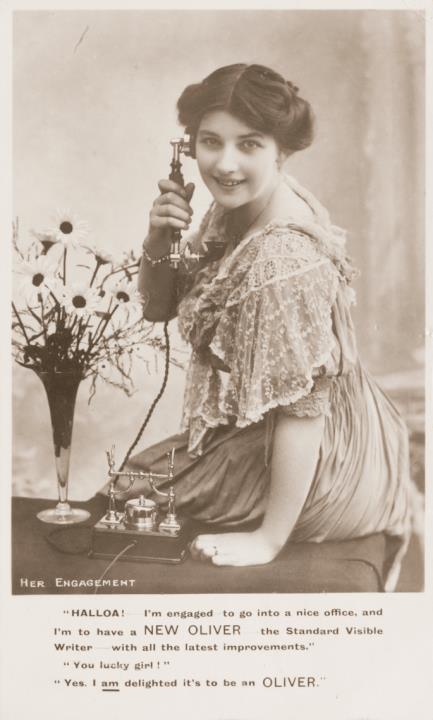 Werbepostkarte; Fotografie, monochrom Rückseite: Frau mit Telefon, Blumen als Dekoration; darunter Werbetext für Schreibmaschine Oliver; Vorderseite: Logo Oliver; nicht beschrieben