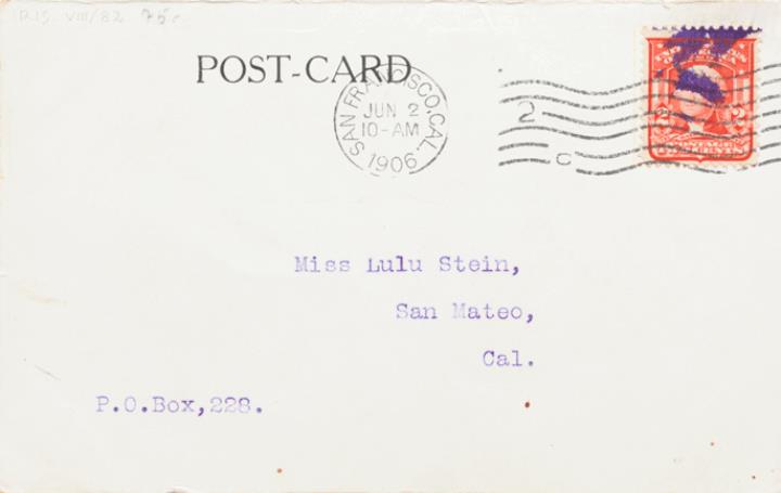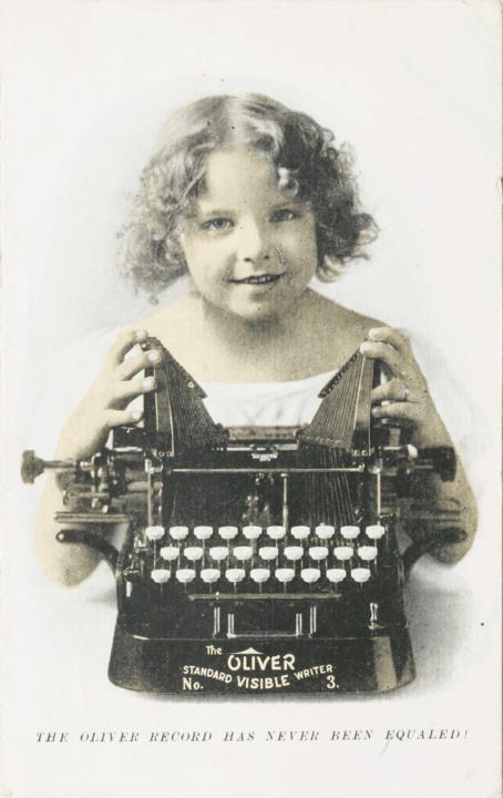 Werbepostkarte; Fotografie, koloriert Rückseite: Kind mit Schreibmaschine Oliver No. 3 Vorderseite: adressiert an Miss Stein, San Mateo; Briefmarke U.S. Postage Two Cent; Poststempel San Francisco Jun 2 1906