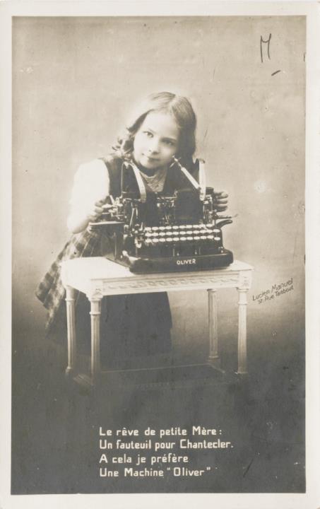 Werbepostkarte; Fotografie, monochrom Rückseite: Mädchen mit Schreibmaschine Oliver, darunter Werbetext in Versform Vorderseite nicht beschrieben