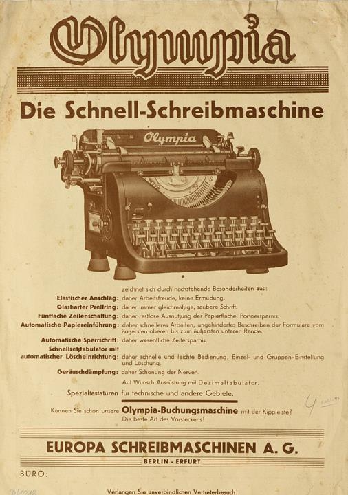Next to literature on the history of technology, of the typewriter and the office, the Archive holds patent letters, textbooks and instruction manuals as well as historical postcards, letters, photographs and various kinds of advertising (leaflets and brochures, advertising stamps, newspaper ads, posters and signs, promotional gifts).