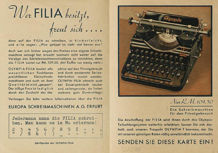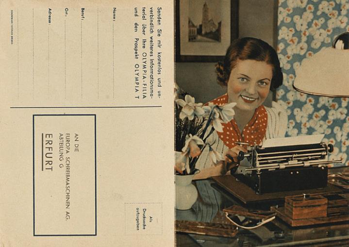 Faltprospekt für Schreibmaschine Olympia Filia mit Antwortkarte Druck: Schünemann Tiefdruck Bremen