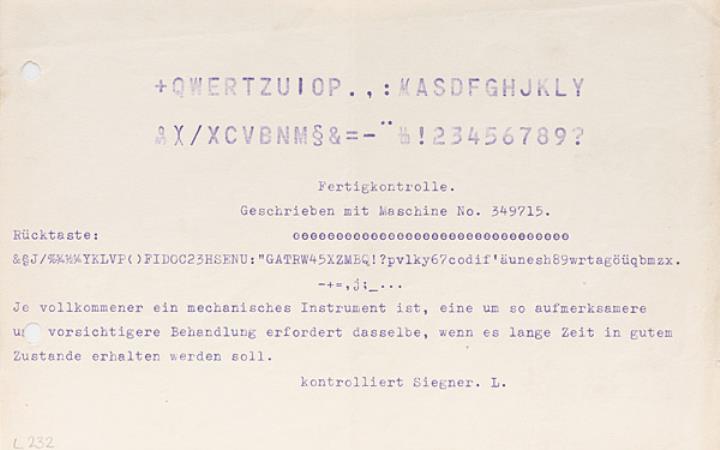 Schriftkontrollschein für Schreibmaschine Nr. 349715 eines nicht genannten Herstellers