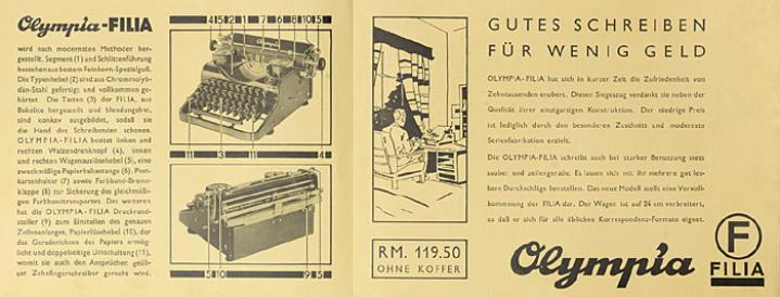 Faltprospekt für Schreibmaschine Olympia Filia Nr. D 45/BA 1