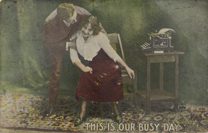 Illustrierte Postkarte; Fotografie, koloriert; Serie 3-8 Des. Rückseite: Vorgesetzter/Mitarbeiter und Sekretärin mit Schreibmaschine in romantischer Büroszene Vorderseite: beschrieben; adressiert an Mr. Overton, N. Y.; Briefmarke U.S. Postage 1 Cent; Poststempel N. Y./ Aug 31 1915