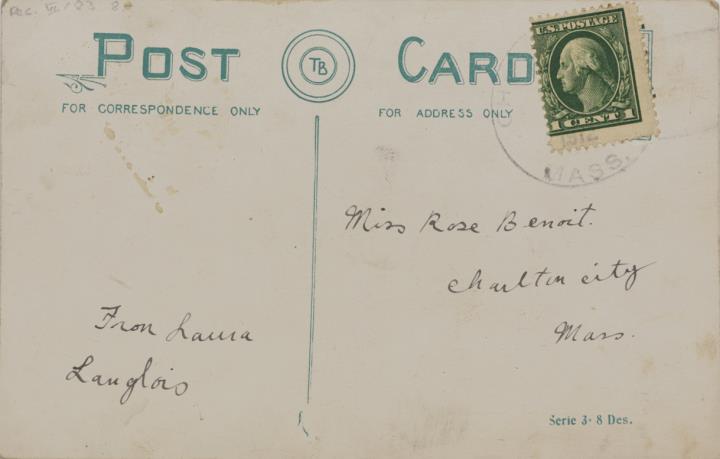 Illustrierte Postkarte; Fotografie, koloriert; Serie 3-8 Des. Rückseite: Vorgesetzter/Mitarbeiter und Sekretärin mit Schreibmaschine in romantischer Büroszene Vorderseite: beschrieben; adressiert an Miss Benoit, Charlton City; Briefmarke U.S. Postage 1 Cent