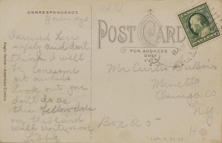 Illustrierte Postkarte; Grafik, Fotografie, polychrom; Anglo Series-American Comics Nr. 18; Rückseite: Vorgesetzter/Mitarbeiter und Sekretärin mit Schreibmaschine in Büroszene Vorderseite: beschrieben; adressiert an Mr. DuBois, N.Y.; Briefmarke U.S. Postage One Cent