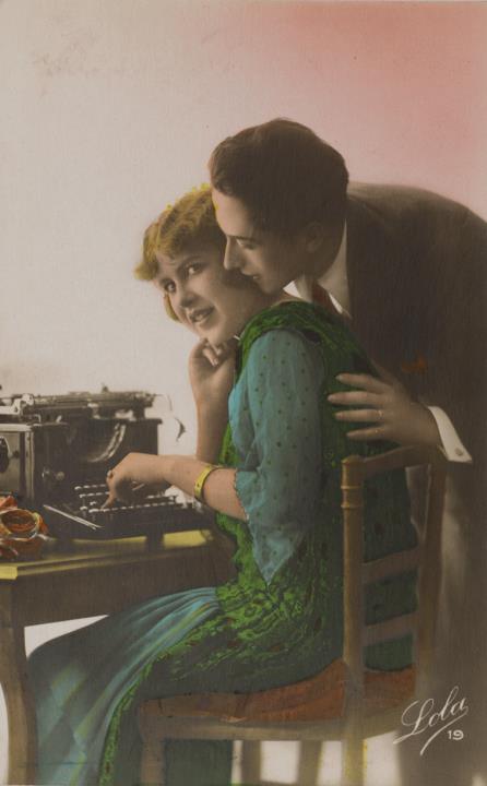 Illustrierte Postkarte; Fotografie, koloriert; Serie Lola 19 Rückseite: Mann und Frau mit Schreibmaschine in romantischer Szene Vorderseite beschrieben