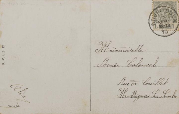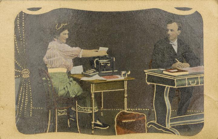 Illustrierte Postkarte; Grafik, Fotografie, polychrom; Serie Nr. 20 Rückseite: Vorgesetzter/Mitarbeiter und Sekretärin mit Schreibmaschine in romantischer Büroszene Vorderseite: adressiert an Mademoiselle Colonval, Montignies sur Sambre; Briefmarke Postes Belgique 1c; Poststempel Bouffioulx/7 Sep 1910