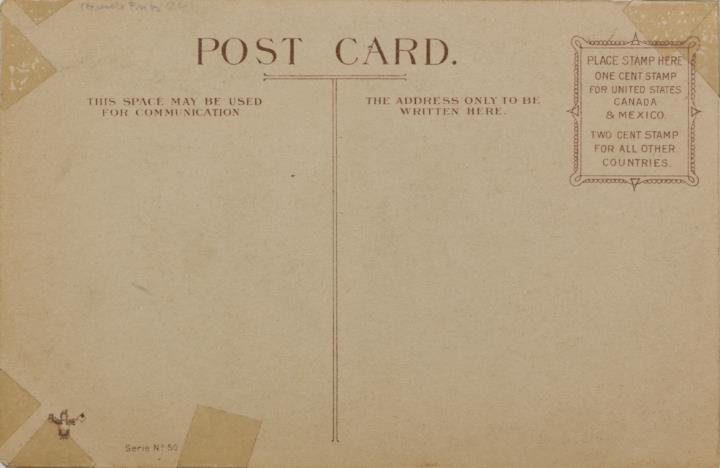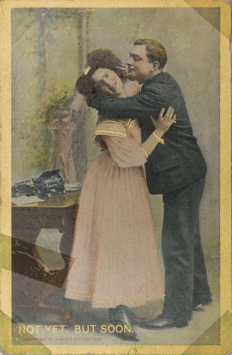 Illustrierte Postkarte; Grafik, Fotografie, polychrom; Serie Nr. 50, copyright: Martha Steuer 1909 Rückseite: Vorgesetzter/Mitarbeiter und Sekretärin in Büroszene, Schreibmaschine im Hintergrund Vorderseite nicht beschrieben