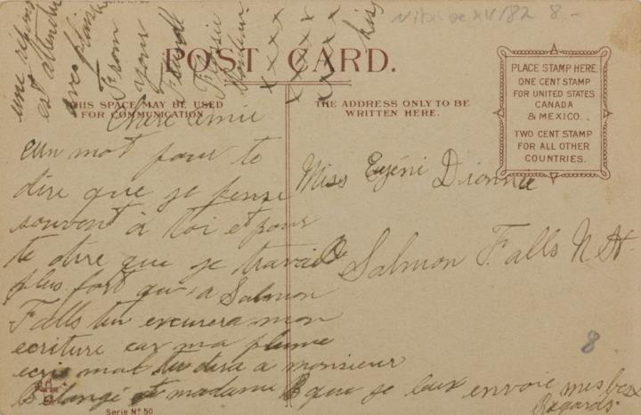 Illustrierte Postkarte; Grafik, Fotografie, polychrom Serie Nr. 50, copyright: Martha Steuer 1909 Rückseite: Vorgesetzter/Mitarbeiter und Sekretärin in romantischer Büroszene, daneben Tisch mit Schreibmaschine Vorderseite: beschrieben; adressiert an Miss Dionni, Salmon Falls