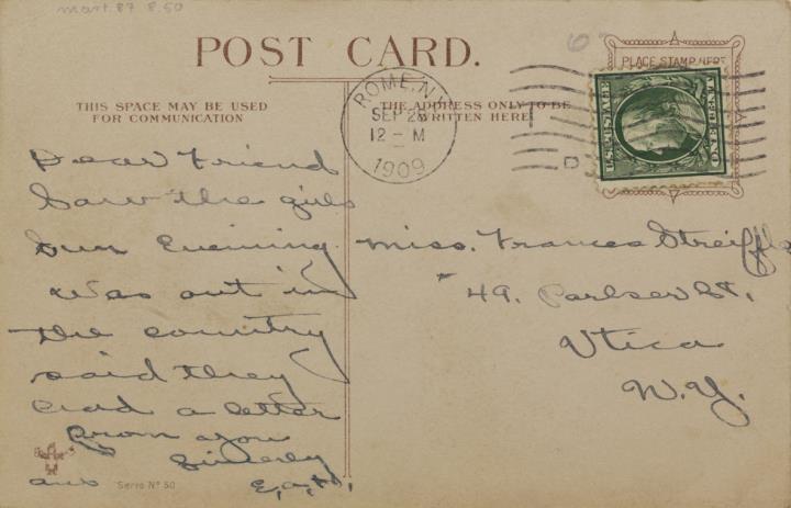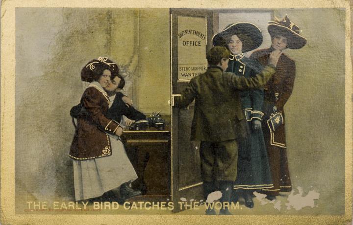 Illustrierte Postkarte; Grafik, Fotografie, polychrom; Serie Nr. 50, copyright: Martha Steuer 1909 Rückseite: Büroszene; Vorgesetzter und Sekretärin als Paar, zwei Damen betreten das Büro Vorderseite: beschrieben; adressiert an Miss Streiffler, Utica; Briefmarke U.S. Postage One Cent; Poststempel Rome N.Y./Sep 28 1909;