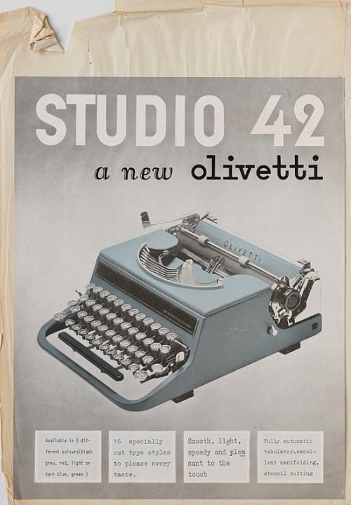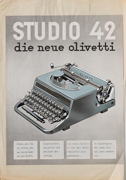 vier Werbebilder (Entwürfe für Prospekt) für Schreibmaschine Olivetti Studio 42; auf Papier geklebt Details mit weißem Stift akzentuiert polychrom