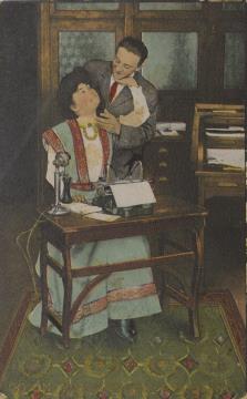 Illustrierte Postkarte; Grafik, polychrom; Typewriter Series No. 202 (5) Rückseite: Vorgesetzter/Mitarbeiter und Sekretärin in romantischer Büroszene; Text: [...] And thus he wins his Love's dear charms. Vorderseite beschrieben