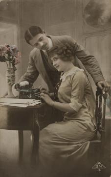 Illustrierte Postkarte; Grafik, polychrom; Typewriter Series No. 202 (1) Rückseite: Vorgesetzter/Mitarbeiter und Sekretärin mit Schreibmaschine in romantischer Büroszene; Text: [...] As his gaze on her fondly lingers. Vorderseite nicht beschrieben