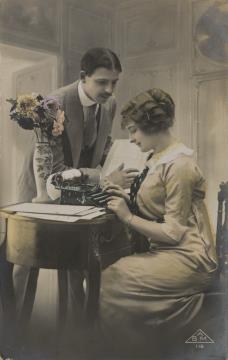 Illustrierte Postkarte; Fotografie, koloriert; Serie ABM 116 Rückseite: Vorgesetzter und Sekretärin mit Schreibmaschine in romantischer Büroszene, Blumen als Dekoration Vorderseite: beschrieben, adressiert an Monsieur Colart, Aachen Burtscheid; Briefmarken Postes Belgique 5c+5c; Poststempel 19-20 V 1912