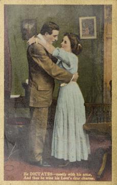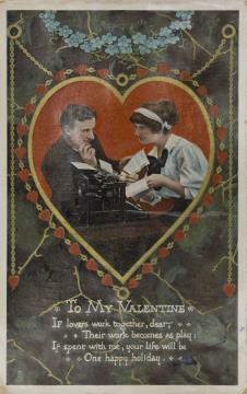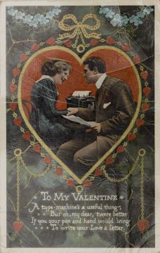 Illustrierte Postkarte; Grafik, polychrom; Serie Nr. 174 Rückseite: Vorgesetzter/Mitarbeiter und Sekretärin mit Schreibmaschine in romantischer Büroszene; Umrahmung in Herzform, darunter Text in Versform Vorderseite: beschrieben, datiert Feb 13 1911; adressiert an Miss Cowell, Douglas (Stempel); Briefmarke Postage Revenue (U.K.) One Penny